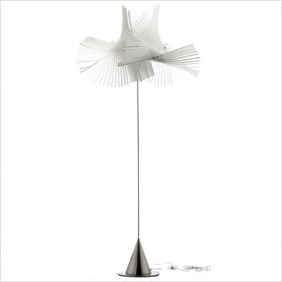 MMIK P CHW-24 Shade Color: Yellow Pictured in american white The shade of Mikado Lamp is composed of two die-cut sheets of wood veneer, mounted to a pattern that lends torsion and dynamism. Like entwined feathers, the stamped strips create a pliable shape in the air that is charged with sensuality, creating an overall airiness and interesting plays of light and shadow. Designed by Miguel Herranz, the Mikado family of lamps won 2007 Design Plus Prize of ''Light and Building'' in Frankfurt and the 2008 Good Design Award. Learn more about Mini Mikado Floor Lamp below: FEATURES | SPECIFICATIONS FEATURES: -Floor lamp. -Mikado collection. -Designed by Miguel Herranz. -Base and stem finish: Nickel. -Wood veneer shade available in: -American white color. -Cherry color. -Beech color. -Yellow color. -Orange color. -Green color. -Grey color. . -Clear cord. Back to top SPECIFICATIONS: -CUL listed. -Eco friendly. -Accommodates 1 x 20W E-27 low energy fluorescent bulb (included). -Overall dimensions: 63'' H x 27.6'' W. Back to top