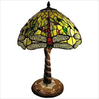 EP18018D-704L This lamp has been handcrafted using methods first developed by Louis Comfort Tiffany. Lamp features colorful hand-blown art glass in a classic Tiffany-inspired design. Tiffany-style Green Dragonfly table lamp will add instant class to your home d cor. Features: -Table lamp. -Finish: Bronze. -Material: Glass / Metal / Resin. -Base is made of white zinc metal. -Lighting has a dominant color of green, red and yellow with a touch of amber cabochon. -Base has a swirl design and touch of mosaic plus a dragonfly sculptured on the bottom. -Contains hand-cut pieces of stained glass. -Each wrapped in fine copper foil. Specifications: -Accommodates: 2 x 60W bulb (not included). -Overall Dimensions: 22'' H x 14'' W x 14'' D.