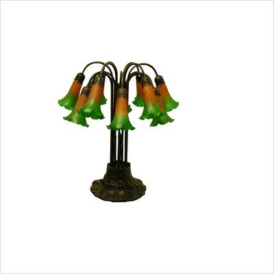 DL-023B+A/G Features: -Table lamp. -Finish: Bronze. -Material: Glass / Metal / Resin. -Amber / Green lily shapes shade. -Cord switch. -Setting indoor. Specifications: -Accommodates: 12 x 25W max candle socket bulb (not included). -Wire Dimensions: 68''. -Overall Dimensions: 25'' H x 24'' W x 24'' D.